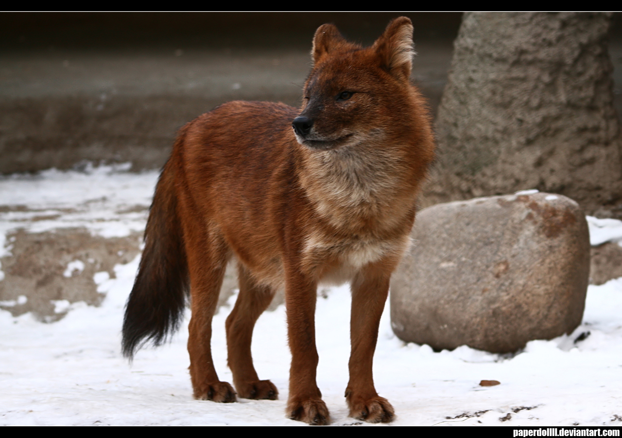 Dholes vary in colours from rust red to sandy beige to charcoal gray depending on their climate and habitat. Their tail is brushy and fox-like often with a black tip on the end. Dholes usually have a white chest, belly and feet but not all of the time. Adults have a long tail and rounded ears. The males tend to be bigger and heavier then the females.